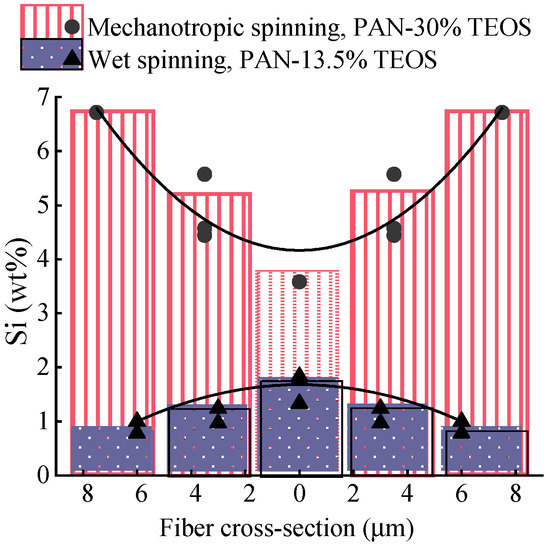 The relationship between the content of silicon along the fiber cross-section (as shown in Figure 13) indicates that the method of fiber production, and therefore, the mechanism of phase separation in the solution jet, predetermines the gradient distribution of SiO2 particles in the fiber. In wet spinning, the fiber core is enriched with silicon, while in mechanotropic spinning, the surface is enriched. In both methods, a twofold difference in silicon concentration between the center and periphery was observed along the fiber cross-section.
