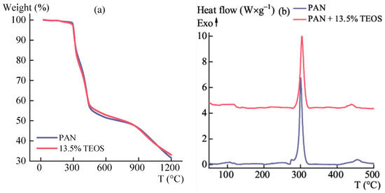 The TGA/DSC data indicate that there are no residual traces of solvent or water in the samples, and the introduced modifier components do not affect the cyclization of PAN fibers. Up to 600 °C, the additives do not affect the weight loss of the samples. It is noteworthy that there are no thermal effects or mass changes when comparing the sample without additives to the one with TEOS, indicating that the HPA reaction in the studied fiber was completed by the time of STA.