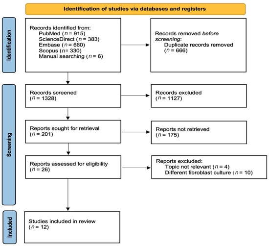 The review process followed the Preferred Reporting System for Systematic Reviews and Meta-Analyses (PRISMA) 2020 statement guidelines to review the physical and biological properties of hydrogels for gingival tissue regeneration (Figure 2). The research question was formulated using the population, intervention, comparison, and outcome (PICO) approach. Full-text papers written in English from PubMed, Embase, ScienceDirect, and Scopus data and a manual search of publications in the last 10 years were used (February 2012–February 2022). The search strategies, including the combination of keywords and the number of articles retrieved, are described in Table 1.