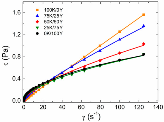 Rotational rheology of film-forming dispersions. Experimental data were fitted with the Herschel–Bulkley model (Equation (1)). Fitted parameters are shown in Table 1.