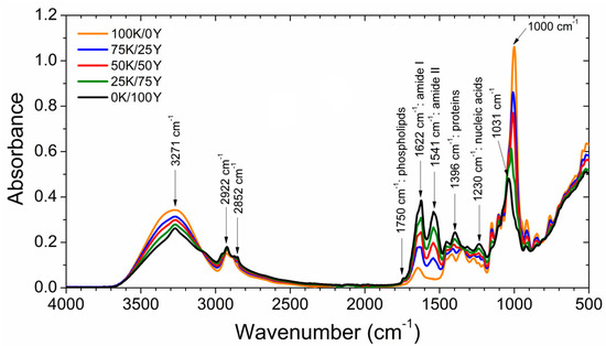 In the mid-region, a peak at 1750 cm−1 corresponding to yeast phospholipids was detected [27], which decreased with the addition of kefir. The zone between 1700 and 1380 cm−1 showed peaks at 1622, 1541 and 1396 cm−1, attributed to amide groups [27]. These bands lost intensity and shifted as the kefir content increased, as expected due to the very low quantity or absence of proteins in water kefir grains [28]. However, a peak near 1630 cm−1 was evident in the 100K/0Y sample, which could be associated with the balancing vibration of the -OH group of the water molecules [42].