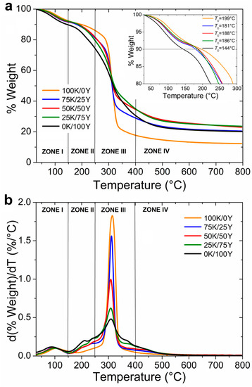 The third degradation zone, between 250 °C and 350 °C, presented the maximum degradation rate of the samples. The Tmax values obtained from Figure 4b for the 100K/0Y, 75K/25Y samples were 315 and 311 °C, respectively, while the value obtained for the 50K/50Y, 25K/75Y and 0K/100Y samples was 309 °C. In this region, the 100K/0Y film showed a higher weight loss of around 69%, while the 0K/100Y sample presented a lower weight loss of around 45%. These results corresponded to those reported for polysaccharides [44] and protein degradation [45]. Thus, this region could be attributed to the degradation of dextrans of water kefir, mannans and glucans of yeast, and the complete degradation of proteins. Figure 4b showed that as the proportion of yeast increased, there was a noticeable attenuation of the peak. This effect was mainly due to the lower polysaccharide content of the yeast and the fact that some proteins were previously degraded in Zone II. The sharp peak presented in Figure 4b for the 100K/0Y sample described that those materials were mainly composed of one component (dextran), whereas a spread peak was observed in 0K/100Y films due to the complex composition of these films.