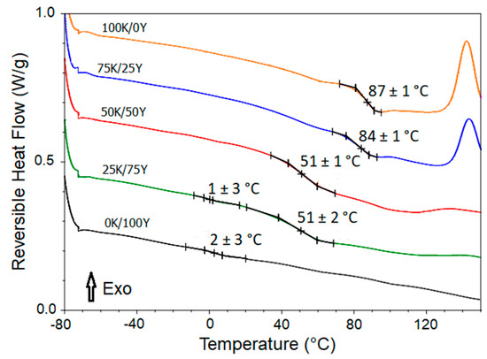 Previous studies have reported that the presence of two Tg in a material indicates the existence of two different phases [46,47]. Therefore, the observation of two Tg values in the 25K/75Y sample suggested a partial phase separation from a calorimetric perspective. These findings were consistent with the results obtained from visual inspection and micrographs of this sample, which showed roughness and inhomogeneity (refer to Section 3.2).