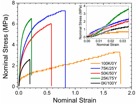 The mechanical properties of a material depend on its composition, structure and interactions between the constituent polymers. Young’s modulus (Y), maximum tensile strength (TSmax) and elongation at break (e%) were calculated from stress–strain curves (Figure 6) and presented in Table 2.