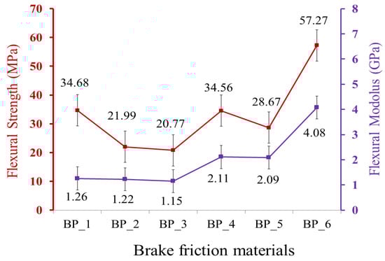 The flexural properties of the BFMs with various compositions of the constituent materials are displayed in Figure 2. The results of this study indicate that the addition of rice husk, Al2O3, and Fe2O3 greatly affects the flexural properties of the resulting BFMs. The red and purple lines in Figure 2 show flexural strength and flexural modulus, respectively. Here, the highest flexural strength and modulus were produced in the BP_6 specimen. The flexural strength and modulus of the BP_6 specimen were 57.27 MPa and 4.08 GPa, respectively. The results of this study indicate that the BP_3 specimen produced the lowest flexural strength and flexural modulus, which were 20.77 MPa and 1.15 GPa. Meanwhile, the flexural strength and flexural modulus of the epoxy resin (BP_1 specimen) were 34.68 MPa and 1.26 GPa. Based on the research results, only the BP_6 specimen had higher flexural strength and flexural modulus than the flexural strength and flexural modulus of the BP_1 specimen.