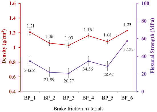 Furthermore, the flexural strength produced in this study has the same trend as the density of each BFM specimen. The relationship between density and flexural strength produced in this study is illustrated in Figure 3. The red and purple lines in Figure 3 show density and flexural strength, respectively. The higher the density value, the higher the flexural strength of the BFMs specimen, and conversely [,]. The highest flexural strength was discovered in the BP_6 specimen since it has the highest density. In contrast, the lowest flexural strength was discovered in the BP_3 specimen since it has the lowest density compared to the other specimens.