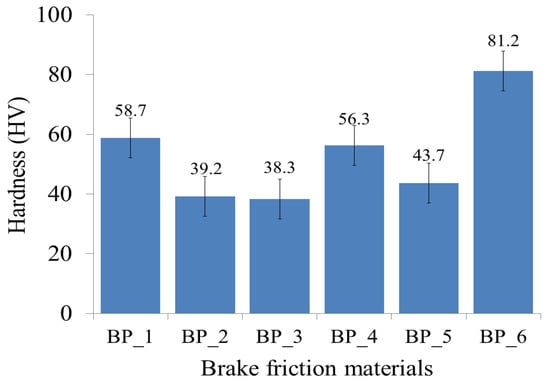 The hardnesses of the BFMs with various compositions of the constituent materials are exhibited in Figure 4. The results of this study indicate that the addition of rice husk, Al2O3, and Fe2O3 greatly affects the hardness of the resulting BFMs. The BP_6 specimen produced a higher hardness than the other specimens, which was 81.2 HV. The results of this study suggest that the BP_3 specimen produced the lowest hardness, which was 38.3 HV; meanwhile, the hardness produced by the epoxy resin (specimen BP_1) is 58.7 HV. Based on the results, only the BP_6 specimen has a higher hardness compared to the hardness of the epoxy resin or BP_1 specimen.