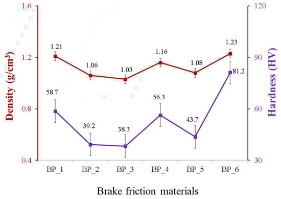 The relationship between the density and hardness of brake friction materials.