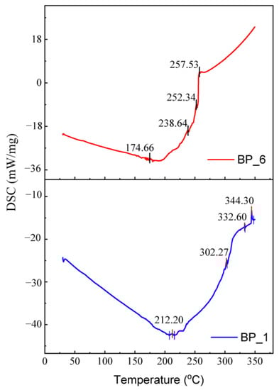 The results of the DSC test for specimens BP_1 and BP_6 are demonstrated in Figure 6. In this test, the specimens were analyzed at a heating rate of 20 °C/min in a temperature range of 30–350 °C. In the BP_6 specimen, a peak was established at 30–180 °C, indicating the presence of water molecules [,,]. The presence of water molecules in the BP_6 specimen is indicated by the presence of a peak at 174.66 °C. No exothermic or endothermic reactions were observed in the 50 to 170 °C range, indicating that the specimens BP_1 and BP_6 were stable in this temperature range. Note that the thermal decomposition of hemicellulose starts at around 180 °C and ends at around 350 °C [,,]. From the DSC test results graph, the decomposition of hemicellulose in BP_6 occurs at a temperature of 257.53 °C.