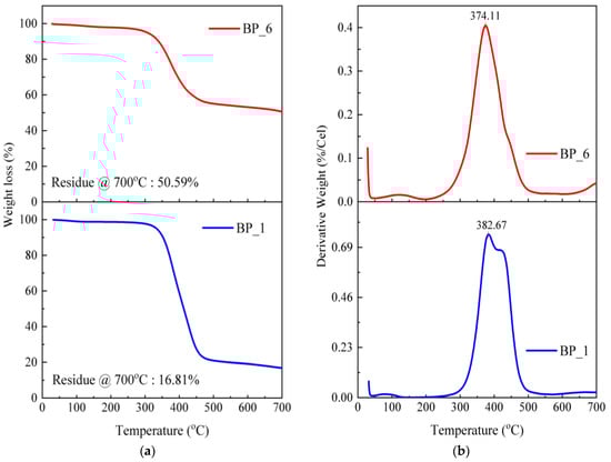 TGA testing applies heat to evaluate the thermal stability (strength of a material at a certain temperature), oxidative stability (rate of absorption of oxygen in a material), and compositional properties (e.g., fillers, polymer resins, solvents) of a sample with a set time and temperature []. In this study, the thermal decomposition of BFM composites occurred between 30 and 700 °C. The BP_1 specimen with a volume fraction of 100% epoxy resin experienced greater weight loss than the BP_6 specimen (Figure 7a).