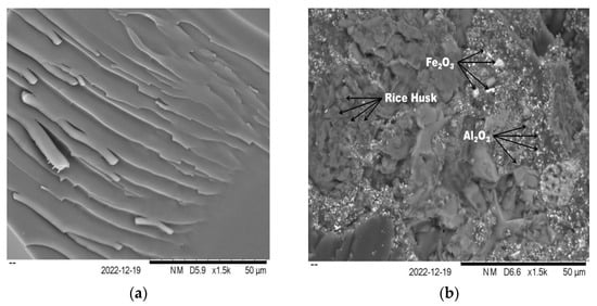 In order to qualitatively evaluate the epoxy, rice husk, Al2O3, and Fe2O3 interfaces, SEM analyses of the fracture surfaces of BP_1 and BP_6 specimens were conducted. A significant difference exists between the fracture surfaces of the BP_1 and BP_6 specimens (Figure 8). Figure 8 illustrates the SEM images of the fracture surface of the epoxy resin as a matrix (Specimen BP_1) and specimen BP_6. The SEM image of the epoxy resin (BP_1 specimens) suggests a smooth cleavage surface and barely visible thin cracks (Figure 8a). This is a distinctive characteristic of brittle failure and crack propagation via indirect paths. On the other hand, images obtained via SEM tests of the BP_6 specimen reveal the eventual presence of rice husk, Al2O3, and Fe2O3 particulate aggregates in the epoxy resin.