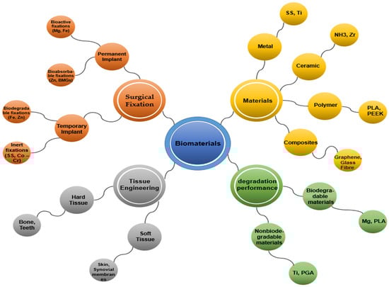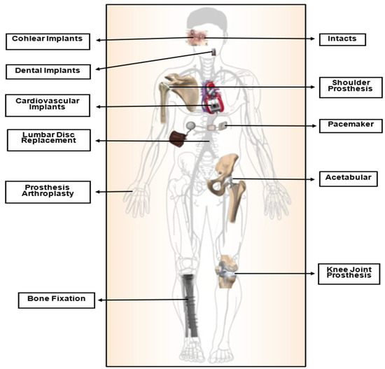Biomaterials have become increasingly crucial in modern times, serving various applications as a result of advances in medicine and material processing in recent decades. They are extensively utilized in various fields, including orthopedics, dentistry, cardiovascular devices, drug delivery, and skin tissue engineering. These materials are specifically designed to interact with biological systems to repair, assess, or replace damaged or malfunctioning bodily tissues, organs, or systems [2,5,6,7], as shown in Figure 1. They are engineered for medical use either independently or as part of a biocompatible system with the body’s tissues and organs [8,9].