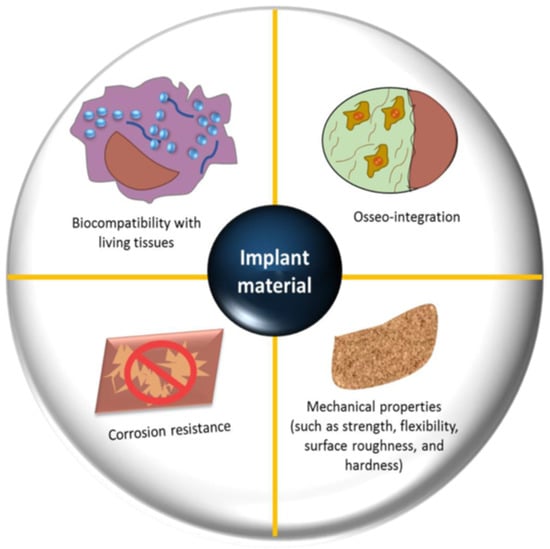 Biomaterials are used in orthopedics to restore the structural integrity of damaged bone or to substitute it. Every biomaterial must fulfill multiple essential criteria, such as possessing suitable mechanical properties (e.g., precise weight and elastic modulus), demonstrating good biostability (resistance to hydrolysis, oxidation, and corrosion), ensuring biocompatibility, particularly in the case of bone prostheses (promoting osseointegration), exhibiting high bio-inertness (non-toxic and non-irritant characteristics), demonstrating high wear resistance, and enabling easy application in practical settings [30,33,42,43]; see Figure 3.