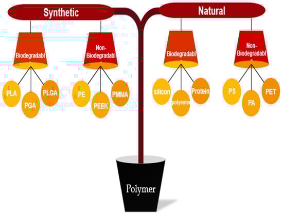 Polymers are classified into two main categories: synthetic and natural. Each section is further divided into two parts: biodegradable and non-biodegradable [174,175,176]. Figure 4 illustrates the categorization of polymers, including some examples.