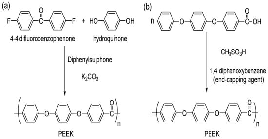 Polyetheretherketone (PEEK) is a thermoplastic polymer known for its high strength-to-weight ratio [187], excellent thermal stability [188], resistance to chemical and biological attacks [189,190], high melting temperatures [191], and glass transition [192]. At room temperature, it is chemically inert and insoluble in most solvents. There are two methods for producing PEEK: electrophilic reactions and nucleophilic displacement reactions, as illustrated in Figure 6 [193].