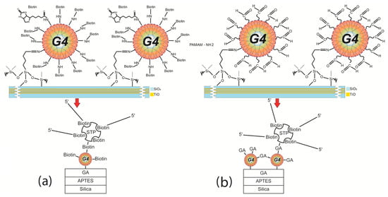 Schematic illustration of (a) poly-amidoamine dendrimers of generation 4.0 (PAMAM G4)-GA, and (b) PAMAM G4-biotin functionalization of the photonic crystal (PC) chip.