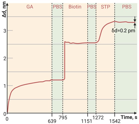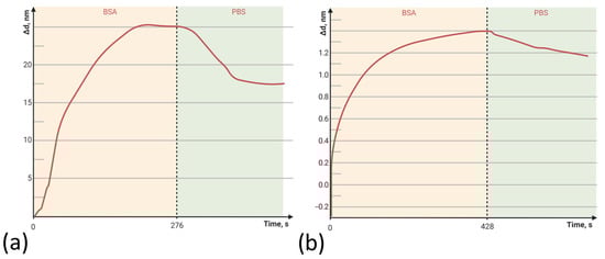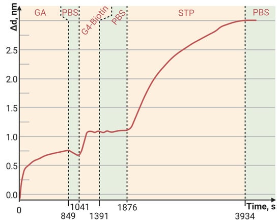 In order to evaluate the specific binding of the model protein to the PC chip’s PAMAM-G4-functionalized surface, we studied the change in the PC-based biosensor’s surface layer thickness at successive stages of its surface pretreatment and in a model experiment. Bovine serum albumin (BSA) was used as a model protein to detect binding to the PAMAM G4-GA layer of the PC chip. Experiments with BSA were carried out in PBS at pH 7.2. BSA solution (0.1 mg/mL) was run through the flow cell at a rate of 50 μL/min until signal stabilization and then rinsed with PBS for 2 min.