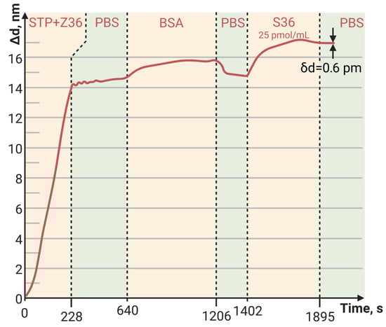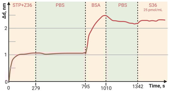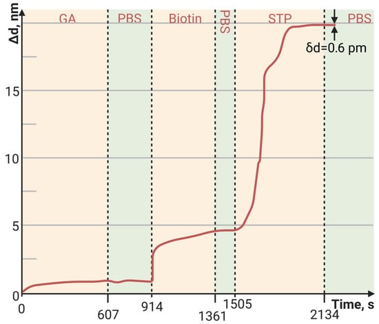 Next, we evaluated the specific binding of STP to the PAMAM-G4-functionalized surface of the PC chip. STP was the key component of the small molecule detection complex. Experiments with STP (0.05 mg/mL) were carried out in the same way as with BSA (Section 3.1).