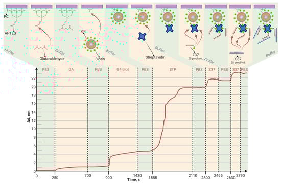 The change in adlayer thickness upon binding of the STP-biotinylated oligosensor Z37 and the following complementary oligotarget of S37 with the PAMAM-G4-biotin-modified PC surface.