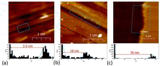 Atomic force microscopy (AFM) was chosen as an independent method for surface investigation at various stages of PC chip formation and biomolecule detection. To control the quality of the APTES-treated PC sensitive surface (see Section 2.3.1), we created a scratch and measured the thickness of the APTES coating as we described earlier []. AFM studies were conducted in a liquid medium (Milli-Q water) to prevent the PAMAM G4 layer from damage and deformation upon drying. Figure 9 illustrates the topology of the scratches made on different PCs modified with APTES, APTES-PAMAM G4-biotin, and APTES-GA-PAMAM G4. The scanning area was 10 × 10 um, and the number of points was 256 × 256. The scan rate was 1 Hz. Height histograms allowed us to measure coating thickness []. As seen in the histogram in Figure 9a, the mean thickness of the APTES layer was 3.5 nm, and the mean height of roughness was 0.5 nm. In agreement with the data given in [], we assume that the silanization protocol chosen to modify the PC chip made it possible to obtain uniform coatings with a reproducible surface topology.