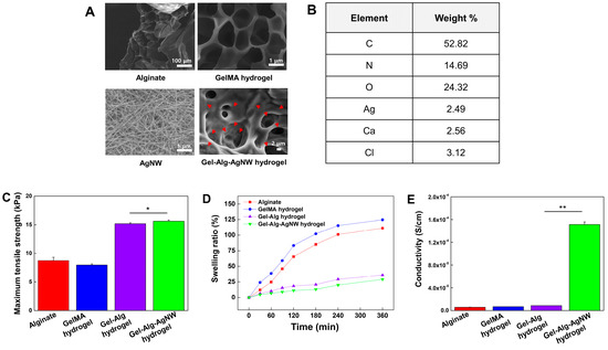 Characterizations of conductive Gel-Alg-AgNW blended hydrogel. SEM images of alginate, GelMA, AgNW, and Gel-Alg-AgNW blended hydrogel (A). The red arrows indicate AgNWs in the hydrogel. EDS analysis of the conductive Gel-Alg-AgNW blended hydrogel (B). Tensile strength (C), swelling ratio (D), and electrical conductivity (E) of alginate, GelMA, Gel-Alg, Gel-Alg-AgNW blended hydrogel (* p < 0.05, ** p < 0.01).