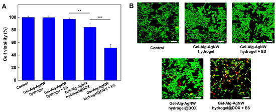 To evaluate the cell death by drug release under ES application of the blended hydrogel patch, 2.5 × 104 B16F10 cells were seeded in 24 microwell plates and were then incubated for 1 day. The freeze-dried Gel-Alg-AgNW blended hydrogel patch was sterilized by irradiating UV rays for 30 min. Then, the hydrogel patch was placed in 10 mL DMEM medium and DOX-loaded DMEM medium, respectively. The Gel-Alg-AgNW blended hydrogel patch and DOX-loaded Gel-Alg-AgNW blended hydrogel patch were placed on each microwell. A 3 V voltage was applied to the Gel-Alg-AgNW blended hydrogel patch for 10 min to observe the viability of melanoma cells at the ES condition. ES was also applied to the DOX-loaded Gel-Alg-AgNW blended hydrogel patch to confirm the release of DOX. The hydrogel patch was removed after ES application and the microwells were placed in a 5% CO2 incubator at 37 °C for 8 h for cellular uptake. To evaluate cell viability, the live/dead assay and MTT assay were performed in the previous way.