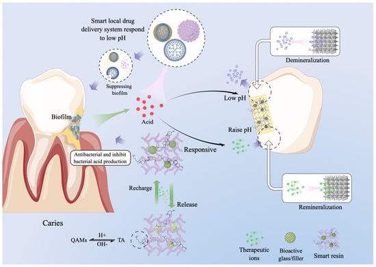 Schematic for dental smart materials. Bacteria adhere to tooth hard tissues to form plaque biofilms. Biofilms metabolize sugars and produce acids, reducing local pH and demineralizing tooth tissues. Smart dental materials respond to low pH and release therapeutic ions, which will raise the pH and promote remineralization. Furthermore, these smart materials can inhibit biofilm growth and diminish acid production. Therapeutic ions can be recharged and re-released to achieve a sustained and long-term remineralizing effect. In addition, smart drug delivery systems can respond to acids produced from bacterial metabolism by releasing loaded antibacterial agents. (Draw by Figdraw).