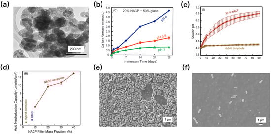 (a) A typical TEM micrograph of the NACP particles. (b) Ca ion release from the nanocomposite filled with 20% NACP and 50% glass. Ca ion release increased with decreasing the solution pH. (c) NACP raised the pH of a cariogenic acid solution (pH 4). The nanocomposite with 30% NACP greatly increased the pH. The commercial composite has little increase in pH. (d) NACP had acid neutralization capacity. It was evaluated by calculating the amount of a base (potassium hydroxide) that would need to be added to the pH 4 solution in order to increase the pH. (e) SEM micrographs of S. mutans on hybrid commercial composite and (f) nanocomposite with 40% NACP. The hybrid commercial composite was nearly entirely covered by bacteria. The nanocomposite had the least bacteria. (Adapted from ref. [17,20], with permission).