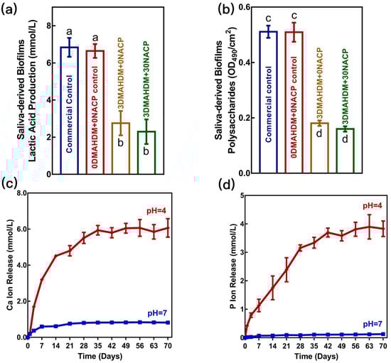 Inhibition effects of composites against the cariogenic activities of saliva-derived biofilms. (a,b) Lactic acid and polysaccharide production by saliva-derived biofilms. The acid and polysaccharide production was significantly reduced by the composites with 3DMAHDM + 0NACP and 3DMAHDM + 30NACP. (c,d) Calcium (Ca) and phosphate (P) ion releases from the 3% DMAHDM + 30% NACP composite immersed in solutions of pH 4 and 7. The ion release substantially increased from pH 4 to 7. (Adapted from ref. [32], with permission.).
