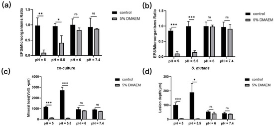 DMAEM@RA decreased the production of EPS of the S. mutans and dual-species biofilms at pH 5 and 5.5. (a,b) Quantitative analysis of the ratios between the EPS and the microorganisms in the 5% DMAEM@RA groups and the control groups at different pH values. DMAEM@RA inhibited the tooth demineralization caused by S. mutans and C. albicans dual-species biofilms in a pH-responsive way in vitro (* p < 0.05, ** p < 0.01, and *** p < 0.001; ns, no statistical significance). (c,d) The values of mineral loss and lesion depth of different groups after treatment for 3 days (* p < 0.05 and *** p < 0.001; ns, no statistical significance). (Adapted from ref. [43], with permission).