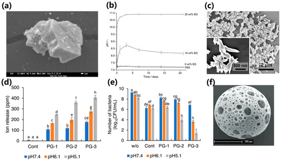 (a) FE-SEM image of the bioglass particle surface. (b) The cured specimens containing 10 wt.% BG induced a pH increase to 8.7 in PBS, which then decreased slightly. In contrast, 20 wt.% BG loading resulted in a pH of 10.8 in PBS, which stayed constant during the 21-day period. (c) SEM images of 20 wt.% loading of BG in Bis-GMA/TEGDMA after immersion in PBS for 21 days, showing calcium phosphate precipitates. (d) With a decrease in pH values, the release of Zn2+ increased significantly by Zn2+-releasing glass in the pH-adjusted BHI broth (p < 0.05) (PG-1, PG-2, PG-3 represented the Zn2+ contents, and the larger the number, the higher the Zn2+ content). (e) Number of viable S. mutans after 24 h incubation at pH 5.1, 6.1, and 7.4 with different content of glass particles (p < 0.05) (PG-1, PG-2, PG-3 represented the Zn2+ contents, and the larger the number, the higher the Zn2+ content). (f) Representative SEM images of PBGSs obtained by flame spheroidization. Glass compositions of P40 (40P2O5–16CaO–20Na2O–24MgO, in mol %). (Adapted from refs. [47,48,49], with permission.).