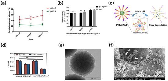 (a) The p(DH)@CHX can release CHX in response to pH. The release of CHX in acidic environments was significantly higher than that in neutral environments. (b) The p(DH)@CHX showed antibacterial effects on S. mutans biofilms, and the biofilm metabolic activity was measured using the MTT assay (* p < 0.05, ** p < 0.01, *** p < 0.001). (c) Proposed concept of pH-responsive biomaterial PMs@NaF. (d) The PMs@NaF-SAP reduced bacterial biomass, indicating the potent ability of providing anti-bacterial adhesion and cariogenic biofilm resistance (**** p < 0.0001). (e) TEM image for CHX-loaded/MSN. (f) SEM image. The CHX-loaded/MSN has the potential to penetrate dentin tubules to release CHX, NP: nanoparticles, ID: intertubular dentine. (Adapted from refs. [53,57,63], with permission).