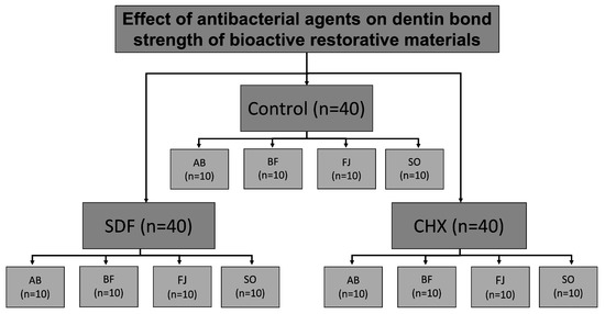 Therefore, the aim of this study was to (i) compare the shear bond strength (SBS) of each of the four bioactive restorative materials, and to determine whether surface treatment with SDF or CHX would influence the bond strength and (ii) to compare the SBS of the different bioactive restorative materials among each surface treatment (SDF, CHX, and no treatment). The following null hypotheses were tested: (1) surface treatment with SDF or CHX does not affect the SBS of each individual restorative material, and (2) there is no difference in the SBS of the different restorative materials among each surface treatment groups.