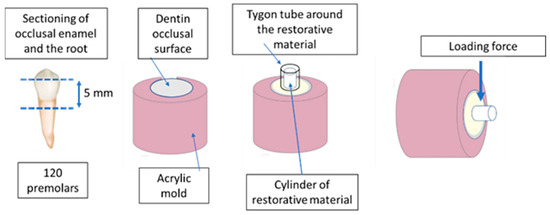 A Tygon tube (ququyi manufacturer, 3 mm × 3 mm “diameter × height”) was placed over the dentin surface and filled with the restorative materials according to the manufacturer’s instructions. Then, the tube was carefully removed using a sharp blade before testing was performed. Specimens were kept in 100% relative humidity for 24 h at 37 °C before testing was performed. A schematic diagram of specimen preparation is presented in Figure 2.