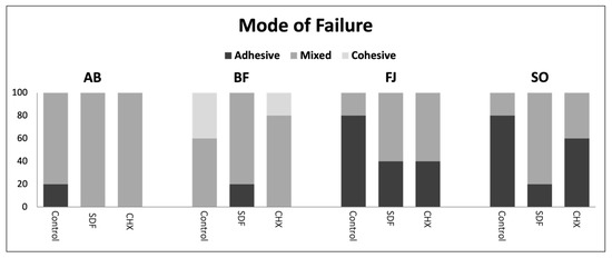 Debonded specimens of different groups demonstrated different modes of failure. In control groups, the mode of failure in AB was 20% adhesive and 80% mixed. BF showed 60% mixed failure and 40% cohesive failure. FJ and SO, however, had exhibited 80% adhesive failure and 20% mixed failure, as shown in Figure 3 and Figure 4. SDF- and CHX-pretreated groups demonstrated a predominantly mixed type of failure, except for CHX-treated SO, which displayed mainly adhesive failure. In AB–SDF and AB–CHX, the mode of failure was 100% mixed. For SDF- and CHX-treated BF, the percentage of mixed failure was 80%, with 20% adhesive failure in SDF and cohesive failure in CHX. For FJ, both SDF- and CHX- treated groups displayed 40% adhesive failure and 60% mixed failure. When treated with SDF, the adhesive failure in SO decreased to 20%. However, with CHX treatment, the failure type was 60% adhesive and 40% mixed.