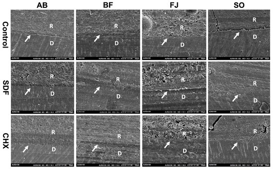 Representative SEM images showing the interfacial bonding of different restorative materials with different surface treatments are shown in Figure 5. The control groups of AB and BF presented better interfacial morphology; the adhesive interfaces were uniform and well-defined, which did not significantly change after SDF or CHX treatment. However, the interface of FJ was slightly irregular. SO also displayed a limited and less homogenous interfacial adaptation to the underlying dentin. Nevertheless, SDF treatment resulted in an improved and more homogenous interface of both FJ and SO groups compared to their respective controls.