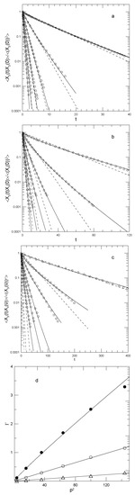 Papadopoulos et al.’s determinations of the time correlation functions appear in Figure 3. They report their determinations as smooth curves, appearing in the figure here as dotted lines. We fit to stretched exponentials (solid lines) and show simple exponentials (dashed lines) where appropriate. There is one behavior for the ring melt and for dilute rings in the 1.8 kDa chain melt (Figure 3a,b), and a somewhat different behavior for dilute rings in melts of the 10 and 20 kDa chains (Figure 3c,d).