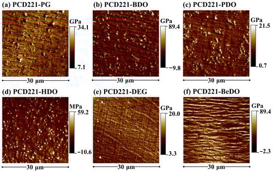 - Schön, P.; Bagdi, K.; Molnár, K.; Markus, P.; Pukánszky, B.; Julius Vancso, G. Quantitative Mapping of Elastic Moduli at the Nanoscale in Phase Separated Polyurethanes by AFM. Eur. Polym. J. 2011, 47, 692–698. [Google Scholar] [CrossRef]