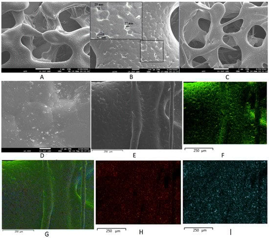 Scanning electron microscopy images of scaffolds (A,B) without particles and (C–E) with wollastonite particles. (F–I) Energy-dispersive X-ray spectroscopy elemental maps of scaffolds with wollastonite particles.