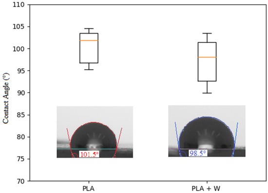 The hydrophobicity of the PLA samples with and without wollastonite particles was measured by the contact angle formed between a drop of 1 µL of water at room temperature and the surface of the printed pellets. Contact-angle-measuring optical equipment with an OCA 15 EC reference was used to capture the images, and the angles were measured by the ORCA software using 1 µL drops of distilled water. Each sample was measured three times using three drops in different pellet areas, and the corresponding average measurements were reported.
