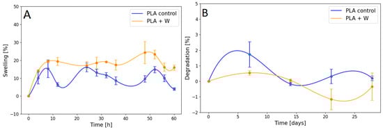 Graph of the (A) swelling ratio and (B) degradation properties of scaffolds prepared using PLA with and without wollastonite particles.