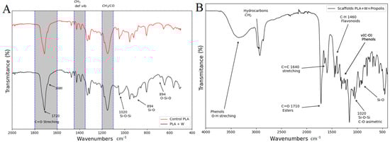 (A) Fourier-transform infrared (FTIR) spectrum for the PLA filament without particles (PLA control) and with wollastonite particles. (B) FTIR spectrum for the scaffold loaded with propolis using the impregnation method.