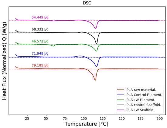 Here, the PLA melting point does not vary considerably regardless of the mechanical or thermal treatment conducted when producing the filaments, the scaffolds, or after adding wollastonite particles. This value is consistent with those reported in the literature [,].