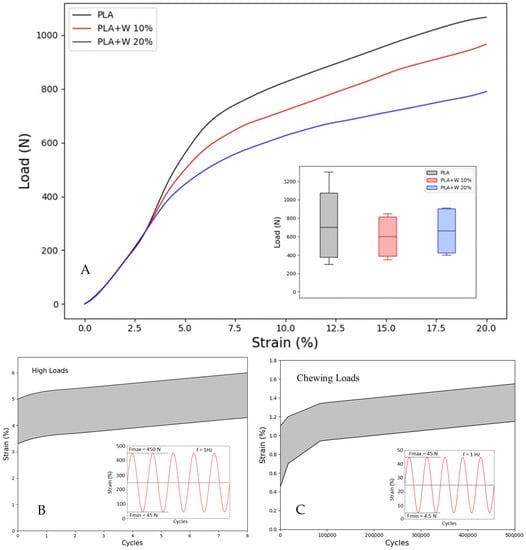 The initial elastic response of the samples shows a slope corresponding to Young’s modulus of the PLA matrix. The strain to reach yield in all the tested samples was close to 7.5%. Further, the inset to Figure 7A shows a box plot of the measured yield loads for various samples, where there are no statistically representative differences between the samples at an average value of Fy = 750 N.