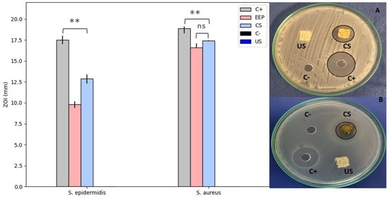 Zone of inhibition (in mm) of the PLA scaffolds impregnated with (CS) and without (US) ethanolic propolis extracts (EEP) against S. aureus (A) and S. epidermidis (B). Results are stat-ed as means ± SD (n = 3) (** p < 0.05, and (ns) points to non-significant difference).