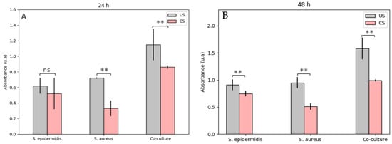Figure 9 illustrates the viability of biofilms formed by S. aureus, S. epidermidis, and their coculture on PLA and wollastonite scaffolds impregnated with (CS) and without (US) EEPs after 24 and 48 h culture. These results denote a decrease in the viability of microbiological growth in CS compared to US; the effect is noticeable after 24 and 48 h culture. In US, the growths of S. aureus and S. epidermidis are similar, although the coculture growth is substantially higher. This behavior denotes variations in the CS, where the growth of S. aureus is the most affected. However, in this group, significantly higher growth of the coculture is also observed. These results confirm that S. aureus is more susceptible to EEPs than S. epidermidis, a fact reported before [].