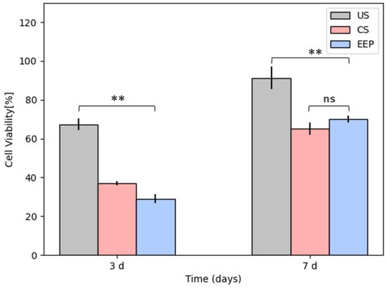Effects of propolis extracts and scaffolds (US and CU) on cell viability/proliferation were evaluated using human pulp-derived mesenchymal stem cells (hDP-MSCs) between the 4th and 8th passage. All cultures were incubated for two different time points (3 and 7 days). At each time point, the metabolic activity and viability of hDP-MSCs seeded (1 × 105 cells/cm2) in 24-well plates TCP (with 150 mg of propolis), scaffolds (US and CU), and TCP plates (control) were evaluated using the MTT (3-(4,5-dimethylthiazol-2-yl)-2,5-diphenyltetrazolium bromide, Sigma) assay. Ten microliters of MTT solution (5 mg mL−1 in phosphate-buffered saline (PBS) was added and incubated for 3 h at 37 °C. Afterwards, the formed formazan salts were dissolved in dimethylsulfoxide (200 μL, Sigma, USA). Finally, the solution was transferred to a 96-well plate, and the absorbance was read at 550 nm (microplate spectrophotometer, MultiscanGo, Thermo Scientific, Waltham, MA, USA). The absorbance of the samples was normalized for the sample area and shown as a percentage respective to TCP wells.