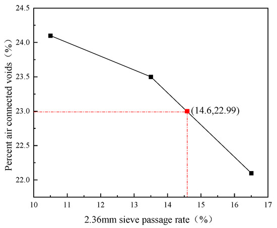 The relationship curve between the 2.36 mm sieve passage rate and the percentage of connected air voids was obtained, as shown in Figure 2. The base mix aggregate gradation corresponding to the target percent connected air voids of 23% (±0.1) was selected, with a final determination of a 2.36 mm sieve passage rate of 14.6%, an expected percent air connected void of 22.99%, and a gradation of S-4.