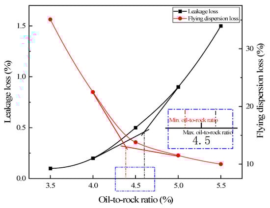 As shown in Figure 3, the slope of the curve appears to change significantly at about 4.5%. The tangents are made from the left and right sides of the curve, and the resulting intersection point is the maximum oil-to-stone ratio, which is 4.6%. As shown in Figure 3, the slope of the curve at 4.5% changes significantly. The tangents are made from the left and right sides of the curve, and the intersection point is the minimum oil-to-stone ratio, which is 4.4%. Therefore, the best oil-to-stone ratio is within 4.4–4.6%, and 4.5% is taken as the best oil-to-stone ratio.