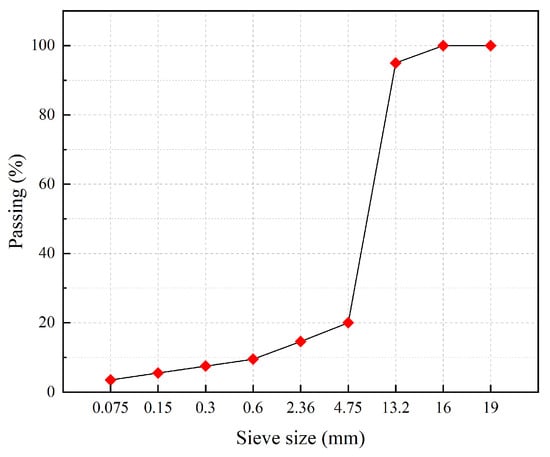 The surface area (A) of the aggregate was calculated according to Equation (1) for the median grade S-2. Based on the desired asphalt film thickness (h), the initial asphalt dosage of the mix was calculated according to Equation (2) . In this study, the asphalt film thickness h of the matrix asphalt mixture was chosen to be 10 μm.